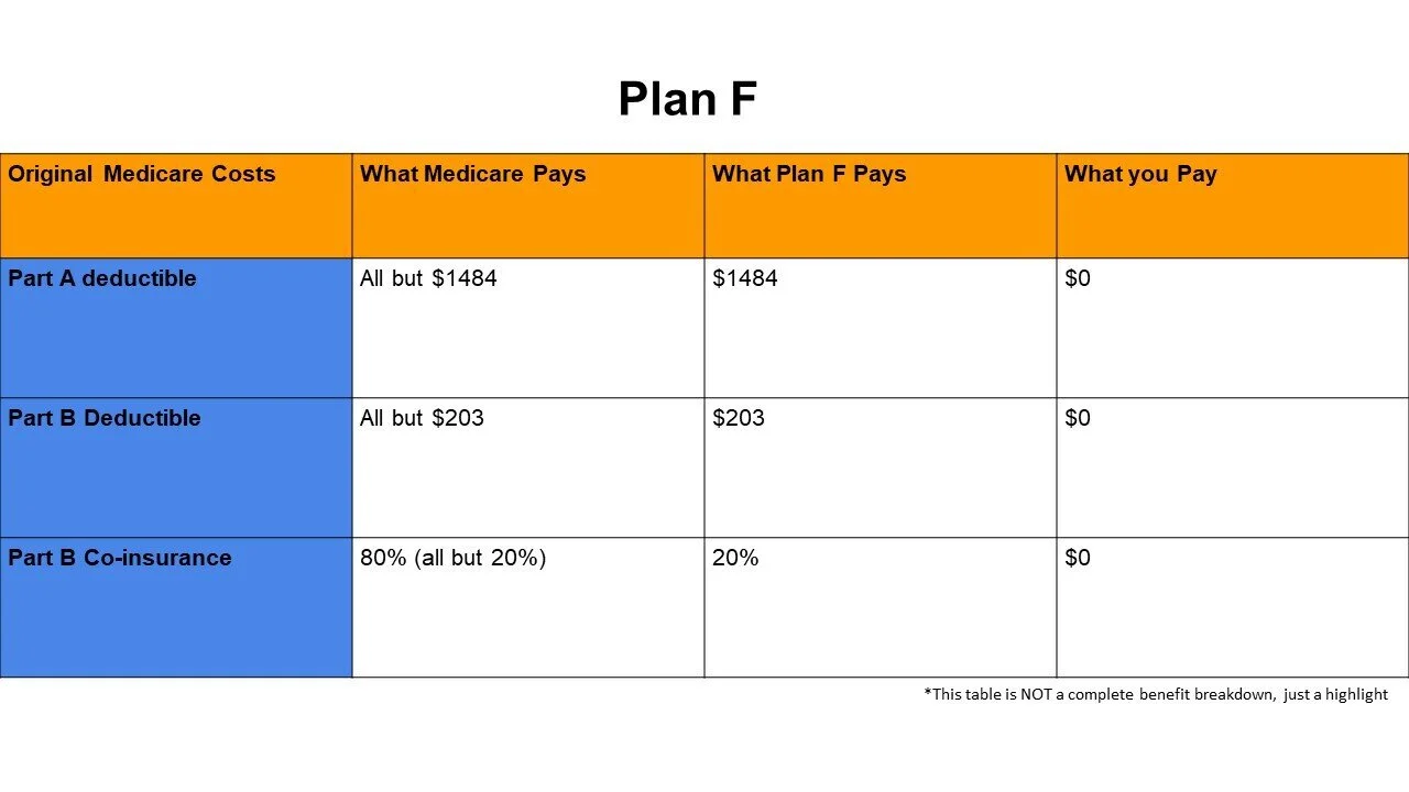 Plan F “The Cadillac” $$$ - We refer to the Plan F as the Cadillac plan. Why? Plan F covers 100% of your out of pocket costs on Original Medicare. These are the Part A and Part B deductibles and coinsurances mentioned above. If the service is covered by Medicare, Plan F should pay 100% of the bill, plain and simple.