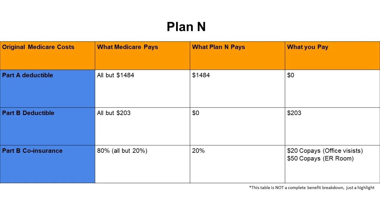 Plan N “The Economical Supplement” $ - Plan N is the third popular Supplement plan. As with Plan F and Plan G, Plan N covers 100% of your inpatient Medicare Part A costs. The outpatient coverage on Plan N is a little different. Like Plan G, you are responsible for the $203 annual Part B deductible. Once that is met you pay $20 copays for doctor office visits (primary care, specialist etc) and $50 copays for ER room visits. Plan N also doesn’t cover excess charges which are not allowed in every state.